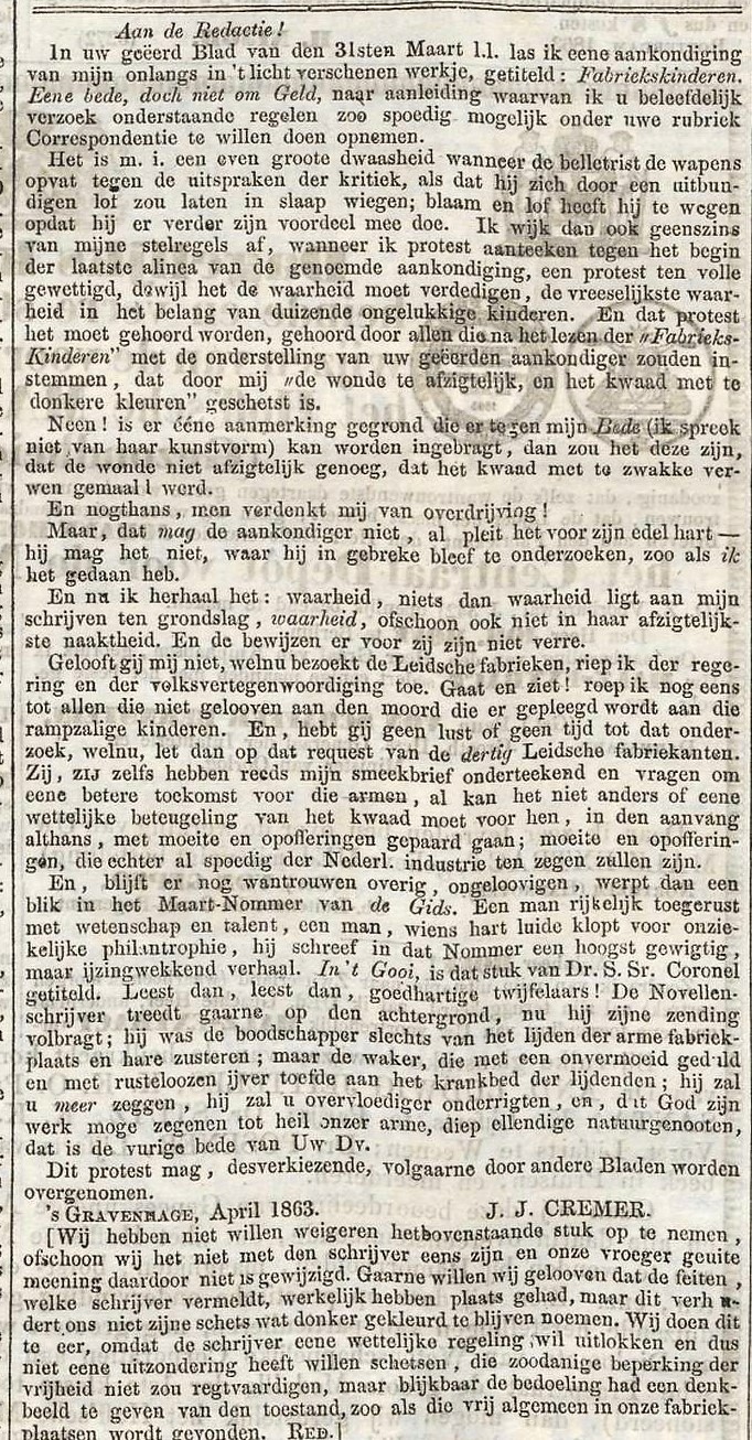 In: Leidsche Courant, 8 april 1863 (Ingezonden brief over Fabriekskinderen)